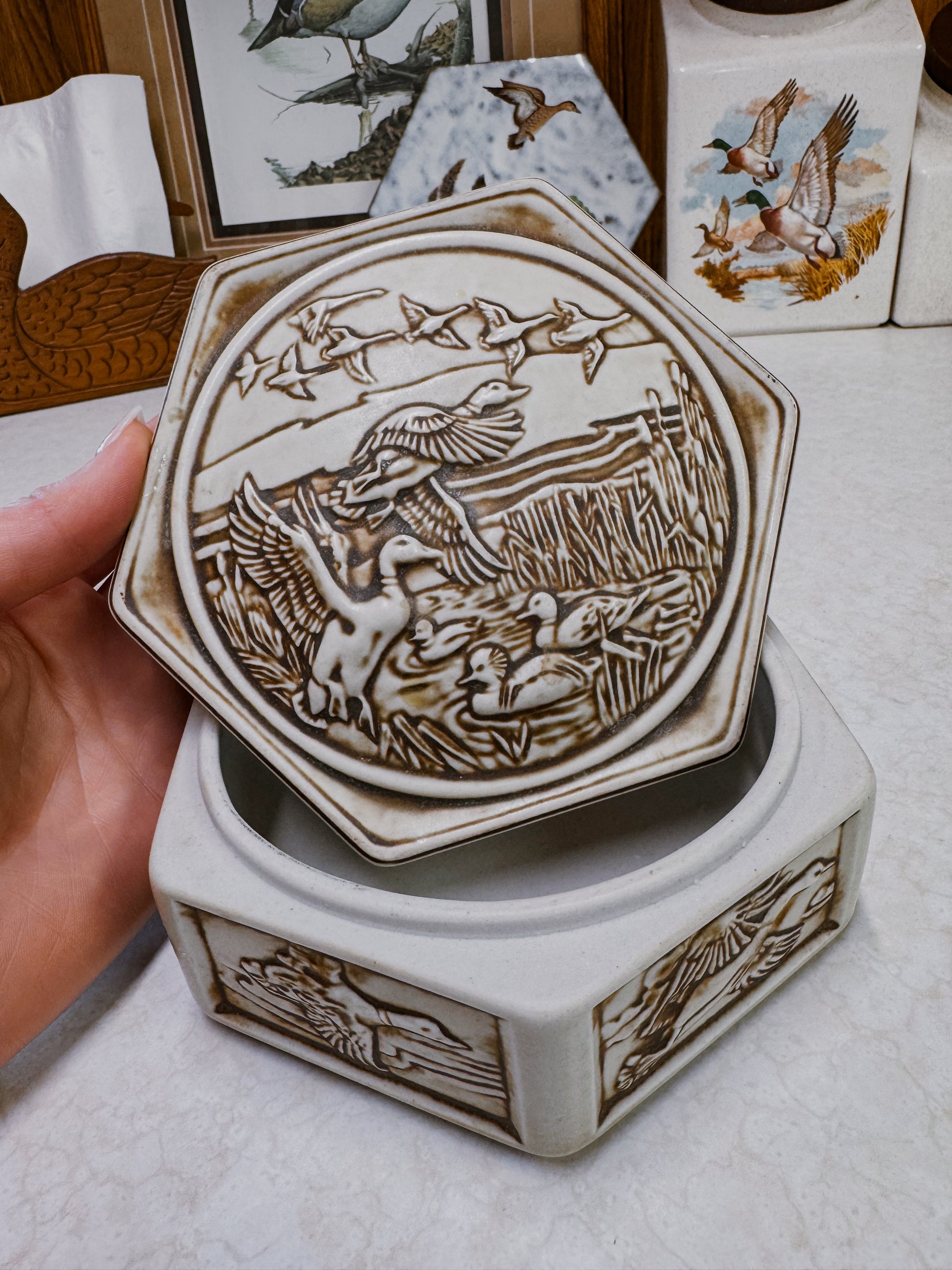 The hexagon lid showcases a marshland scene alive with ducks in flight and at rest among reeds and water. The side panels continue the story with additional waterfowl imagery, creating a full wraparound design that feels cohesive and thoughtfully crafted.