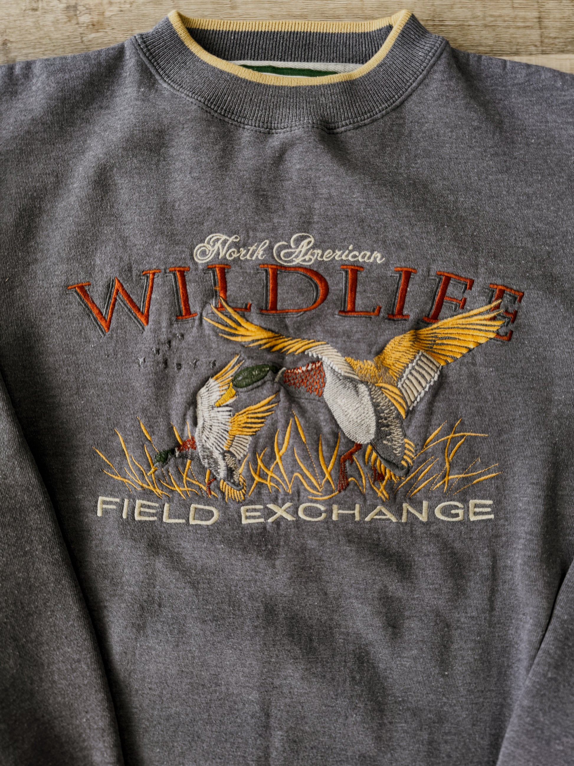This vintage crewneck sweatshirt features a beautifully detailed embroidered mallard scene across the chest with bold lettering that reads North American Wildlife Field Exchange.