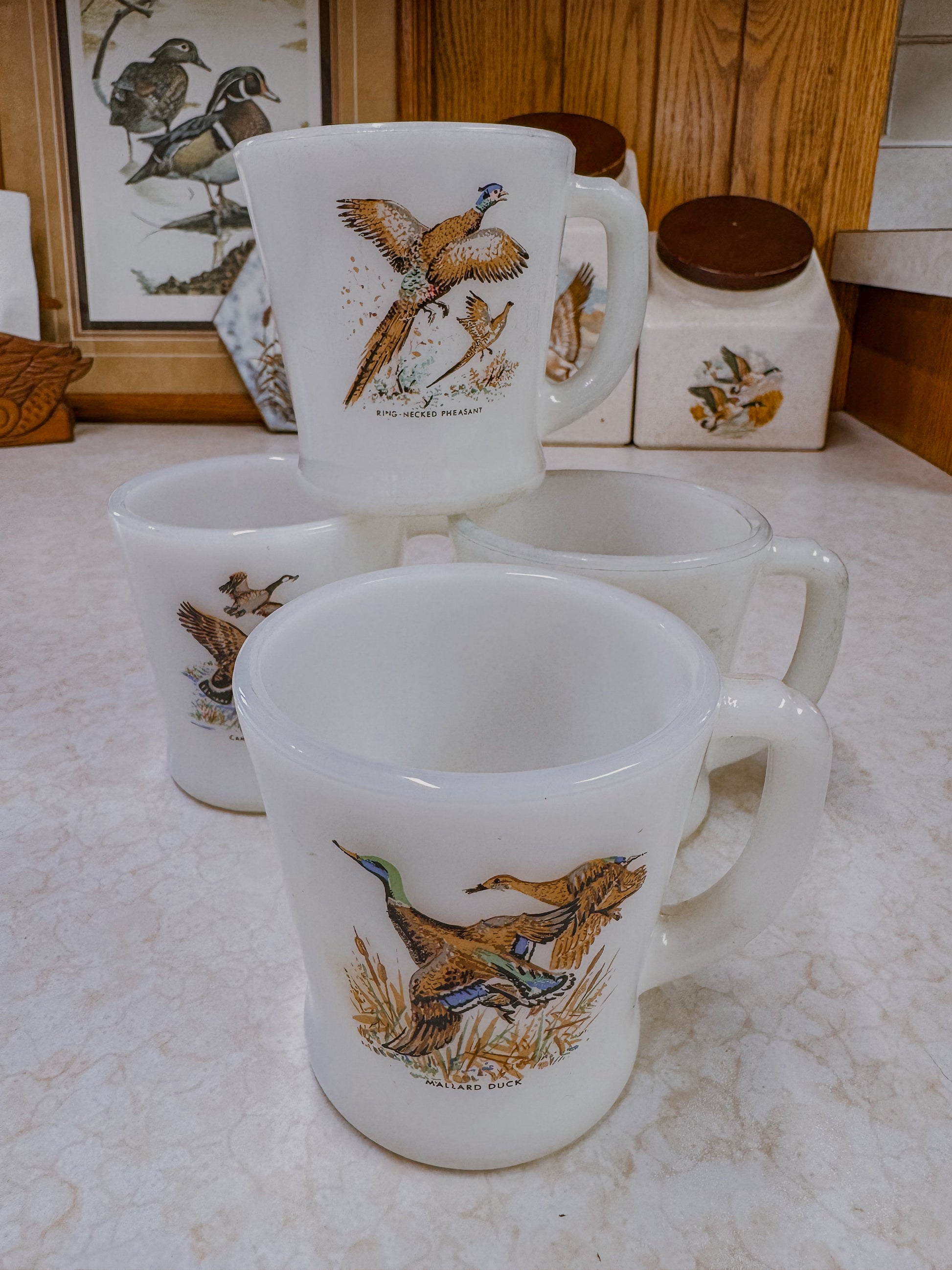 A classic collection made for early mornings before the field and long coffee conversations after. This set of four vintage milk glass mugs features detailed illustrations of beloved game birds, each labeled beneath the artwork. The designs include Ring Necked Pheasant, Ruffed Grouse, Mallard Duck, and Canada Goose.