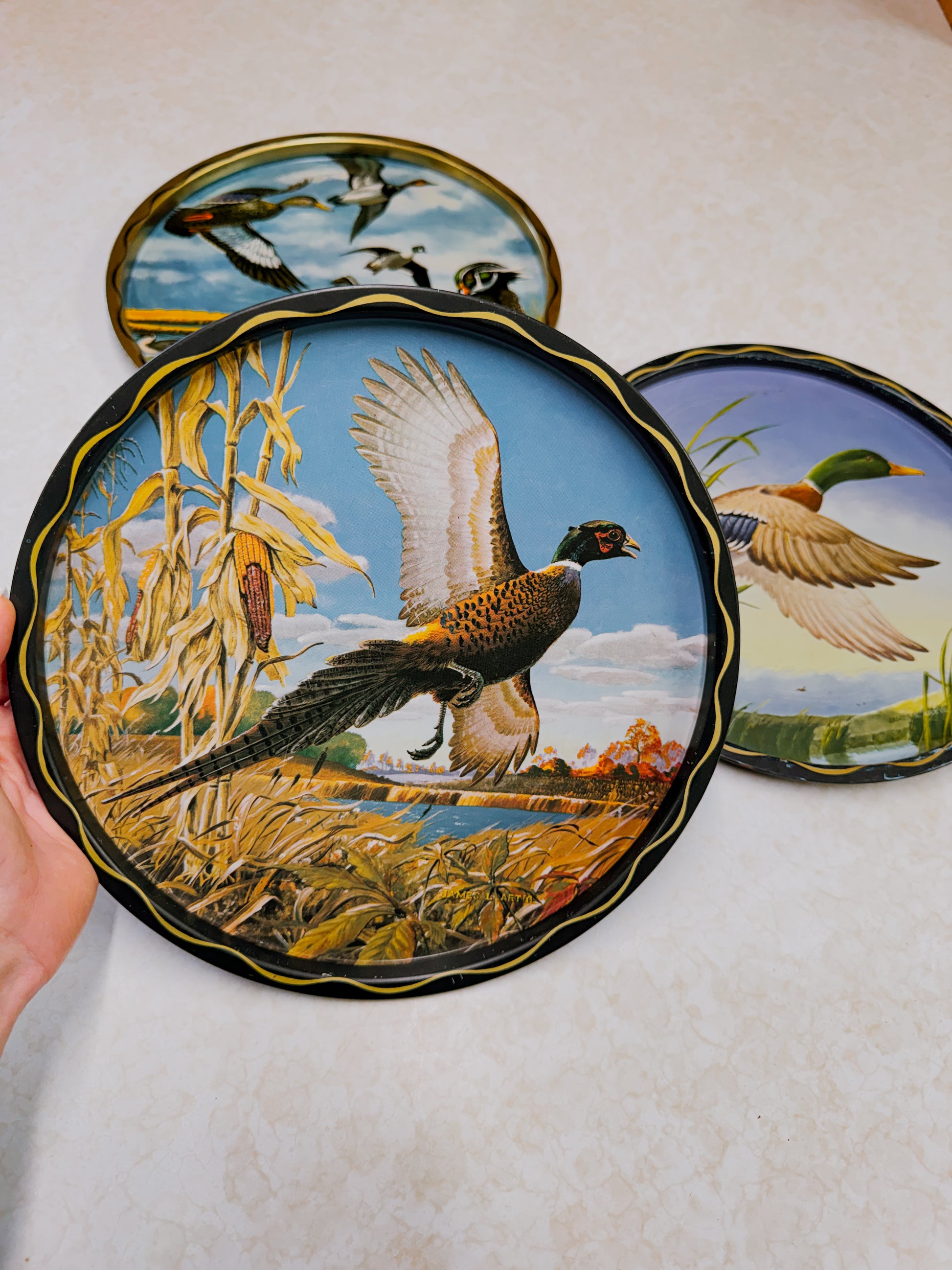 This set includes three round vintage tins featuring iconic upland and waterfowl artwork. Each piece showcases a different outdoor moment. A pheasant rising near standing corn in autumn tones. A mallard drake lifting from the marsh with reeds bending in the breeze. A mixed waterfowl scene with wood ducks and other species gathered along the water.