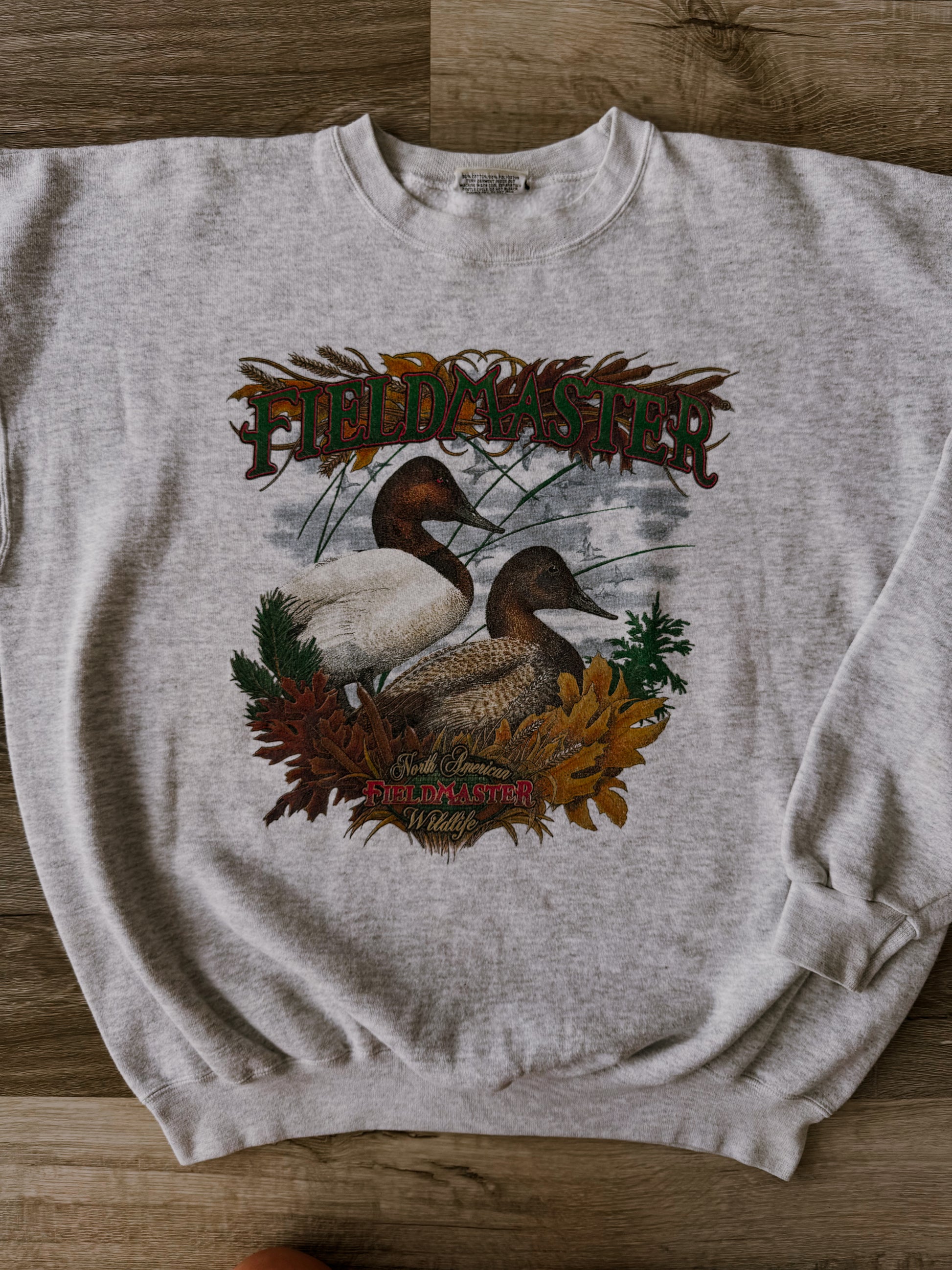 This vintage crewneck sweatshirt features a richly detailed canvasback duck scene framed by autumn foliage and tall marsh grass. Bold lettering across the chest reads Fieldmaster, with North American Wildlife printed beneath the artwork.